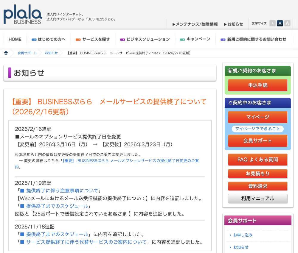 ビジネスぷらら メールサービスの提供終了についてがあっさりと記載されてる。