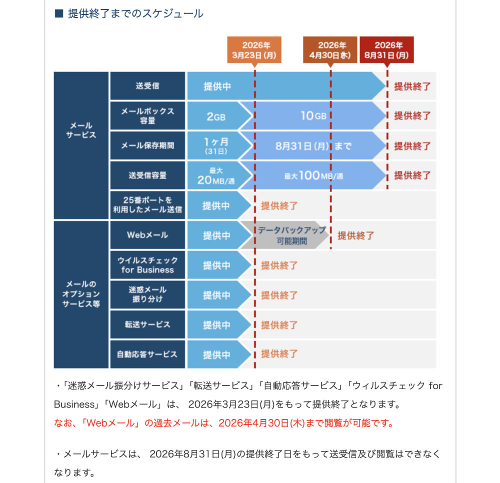 メール自体も2026年8月31日(月)で完全に終了となる(早めに移管しなきゃね)。